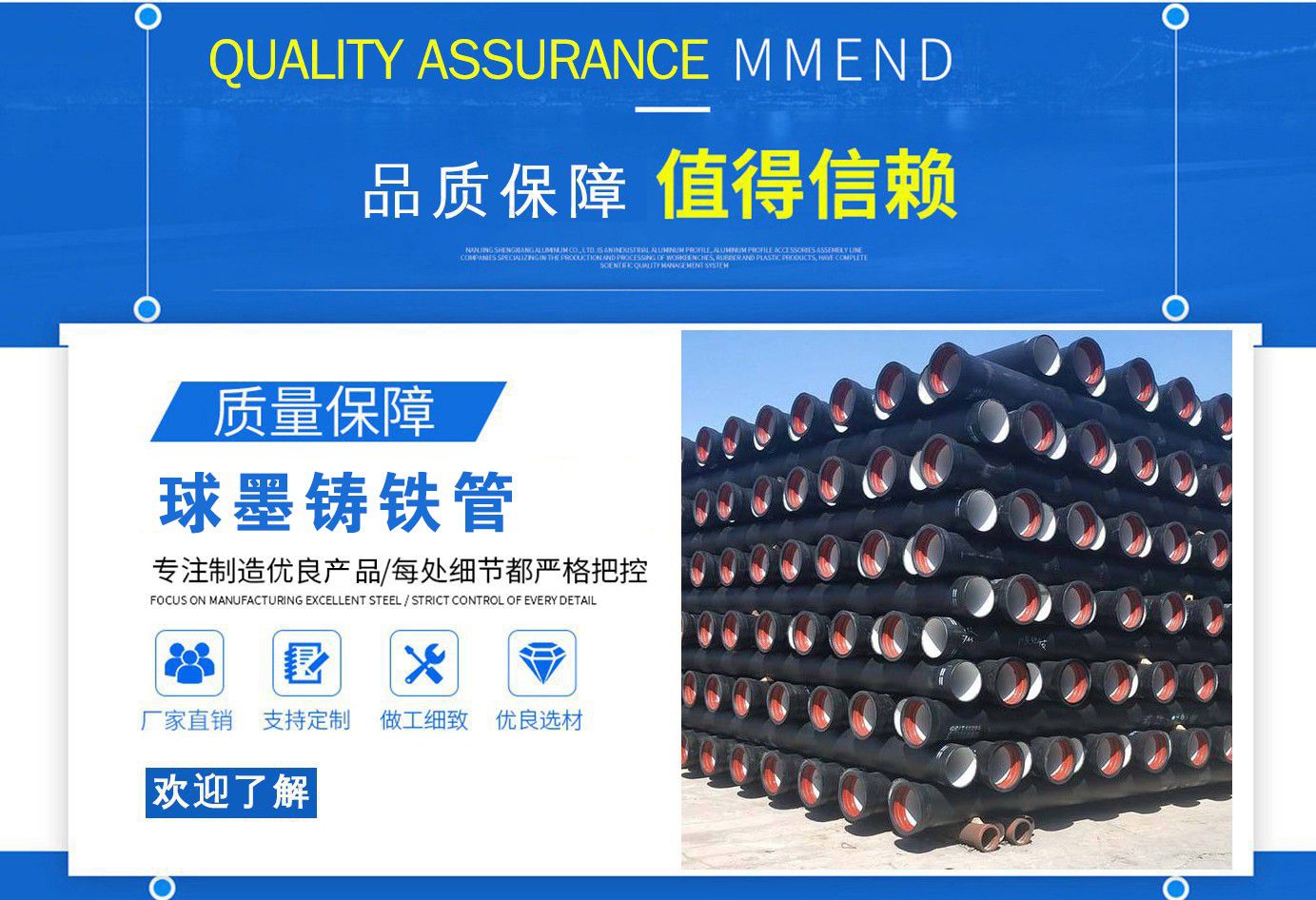 山西飛翔鑄業(yè)有限公司是一家以新興技術致力于研制開發(fā)、生產(chǎn)、銷售、施工安裝各種球墨管廠家,球墨鑄鐵管價格,國標球墨管,k9球墨鑄鐵管,國標球墨鑄鐵管,離心球墨鑄鐵管等系列鑄鐵產(chǎn)品。公司擁有完善的銷售、售后服務體系及一支由鑄造專家、工程師組成的精通產(chǎn)品設備和生產(chǎn)鑄造的技術力量隊伍。隨著企業(yè)的發(fā)展,我們積累了豐富的鑄造經(jīng)驗與科技水平。使得產(chǎn)品具有高強度、高韌性、耐腐蝕性強等性能。同時,我們獲得質量管理體系認證、產(chǎn)品質量認證、職業(yè)健康體系認證、環(huán)境管理體系認證。產(chǎn)品暢銷各地并打入韓國、新加坡等東南亞市場。 在未來的發(fā)展中,公司奉行誠信共雙贏,合作創(chuàng)盛世的企業(yè)理念。讓我們一起共創(chuàng)美好未來! 公司產(chǎn)品采用良好的工藝流程,以確保產(chǎn)品質量的穩(wěn)定性:以良好的設備,確保質量的可靠性。廣泛應用于國內(nèi)外城市的市政建設,通信,自來水,消防,園林,環(huán)保等行業(yè),產(chǎn)品大獲贊譽! 我們有多年的井蓋生產(chǎn)經(jīng)驗,多名老技術工人有將近二十年的生產(chǎn)經(jīng)驗,還聘請多名新技術研發(fā)人員,因為我們始終堅信質量才是未來生存的根本,只有把質量保證了,企業(yè)才會有更加美好的未來。公司堅持用心服務,誠信為本,與時俱進,科技為先的企業(yè)理念,堅持科技先導、竭誠為廣大用戶服務。歡迎各界朋友蒞臨我公司參觀,指導洽談業(yè)務,相信選擇我們就是選擇我們共贏的明天...